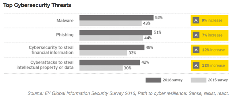 The graph below shows the top cybersecurity threats faced by global companies and in particular it shows there has been a 12 per cent increase in cyber attacks to steal financial information.