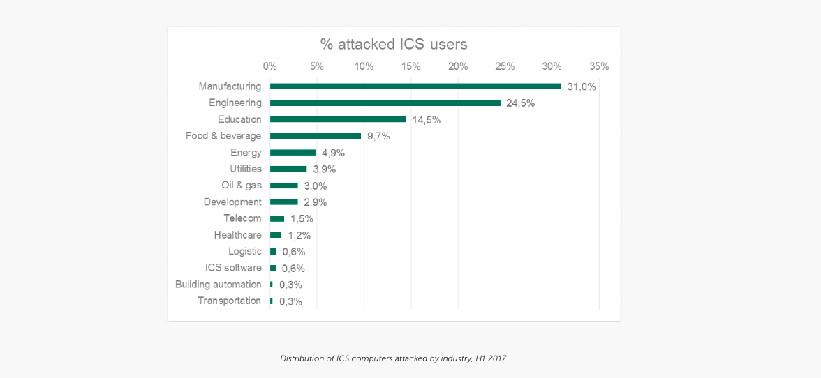 The report said that, during the first six months of the year, the majority of cybercrime attempts on ICS computers were within manufacturing companies, while other industries such as engineering, education and food & beverage were also highly-affected, as shown in the graph below.