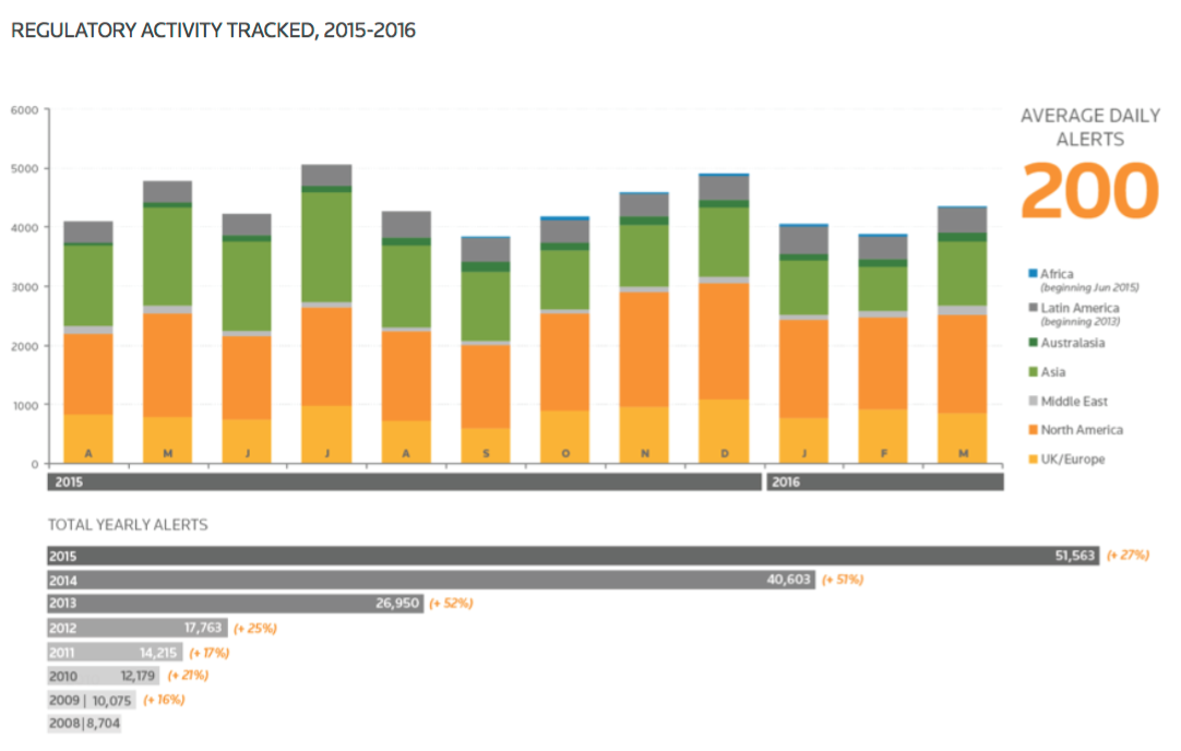 Thomson Reuters tracking of regulatory alerts showed that there are now 200 alerts/business day which is a 27% increase in alerts in 2015: