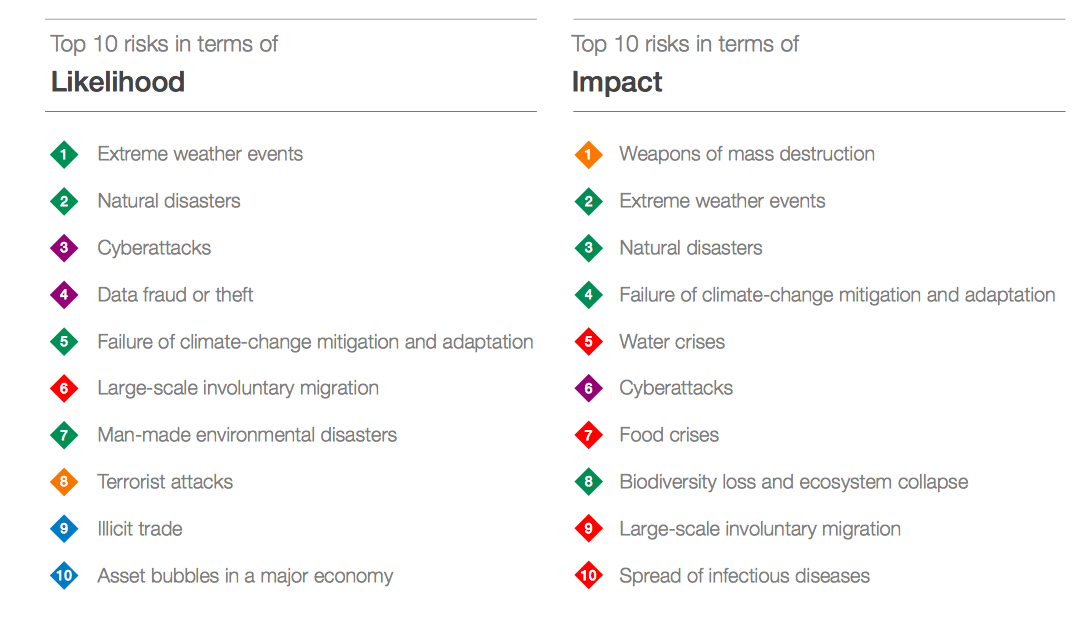 Looking at the risks with most impact, it's also clear that some of the most impactful risks are not among the 10 most likely to occur in 2018, according to the WEF's analysis. Weapons of mass destruction; water crises; food crises; biodiversity loss and ecosystem collapse; and spread of infectious diseases would all have a huge impact – but they aren't among the top 10 risks by likelihood. This raises the issue of how our perception of risk can differ to reality and we often think that risks with greater impact are more likely to occur than in reality. (For example, fear of flying is common even though statistics suggest you are more likely to die in a road traffic accident).