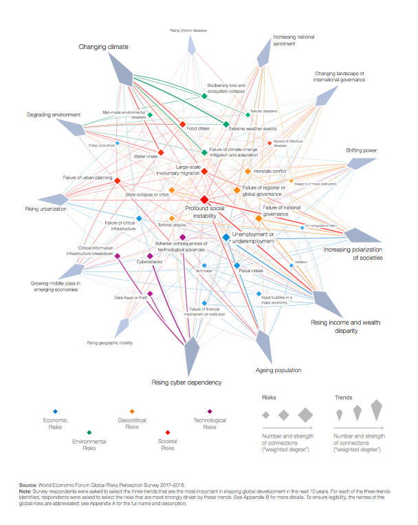 The report illustrates clearly how interconnected the global economy is and how a huge range of factors – from demographics, wealth inequality, societal trends, cyber dependency, as well as politics and the environment – are very closely interwoven to create a web of linked risks – as shown in the risk-trends interconnection map for 2018, below.