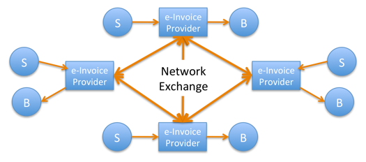 Most buyers use a single e-invoicing service provider, a three-party model, as shown in above. However, the three-party model only works if both buyer and seller use the same service. There are now hundreds of thousands of e-invoicing enabled companies around the world and hundreds of e-invoicing service providers, so buyers and suppliers will not always use the identicalle e-invoicing service. In some scenarios, bilateral agreements have already been put in place between e-invoicing service providers, but these are not standardized and tend to be fragmented and are negotiated on a case by case basis. Demand is growing, particularly from large organisations, for resilient and secure inter-operability between the e-invoicing service provider networks using common standards. This requires a four-party e-invoicing network exchange model with global reach, as shown below.