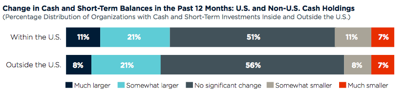 This is one of the findings from the 2017 Liquidity Survey, published by the Association for Financial Professionals (AFP). It found that 32 per cent of financial professionals report an increase in their company's cash holdings within the US in the past 12 months (18 per cent reported a decrease while more than half – 51 per cent – said their cash/investment holdings had not changed significantly). The results don't show much change from 2016. Overall, 63 per cent of companies in the survey said they hold some amount of cash outside the US. The AFP's graph below shows the difference between corporate cash/investment holdings in the US and abroad.