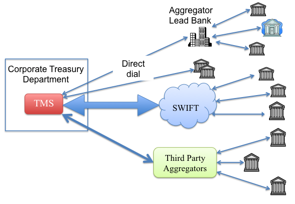 Mostly corporate treasury departments don’t encounter these different formats as they use a treasury management system or aggregation services from either a bank or third party, as shown below.