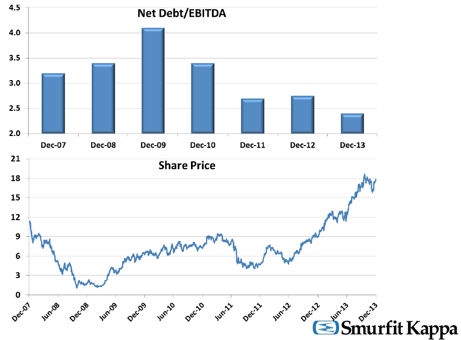 Surfit Kappa impressively moved from highly secured financing with an annualised interest cost of €275 and subordinated debt of €370m; to unsecured debt, annualised interest cost of €155m and no subordinated debt. Not only this, their share price increased significantly, see figure: