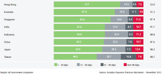 Atradius Group, which provides trade credit insurance, surety and collections services worldwide, carryout an annual Payments Practices Barometer survey in Asia-Pacific region. The 2012 survey of over 1,600 companies in Asia-Pacific (completed in November last year) results showed that: