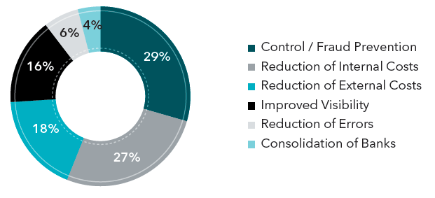 A recent report by SunGard on ‘B2B payments and bank connectivity’ revealed, in their survey of companies with &S$1bn+ turnover in all regions, that the desire to reduce fraud risks and increase controls emerged as the main drivers of payments centralization projects, followed by reduction in either internal or external costs, as figure below shows:
