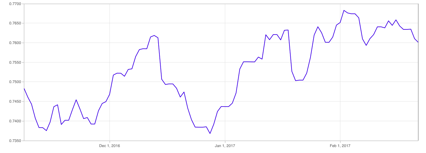 As for the Canadian dollar, the 'loonie' has shown considerable strength since the US presidential election, dipping below 0.74 US dollars before reaching its current value of 0.76 US dollars.
