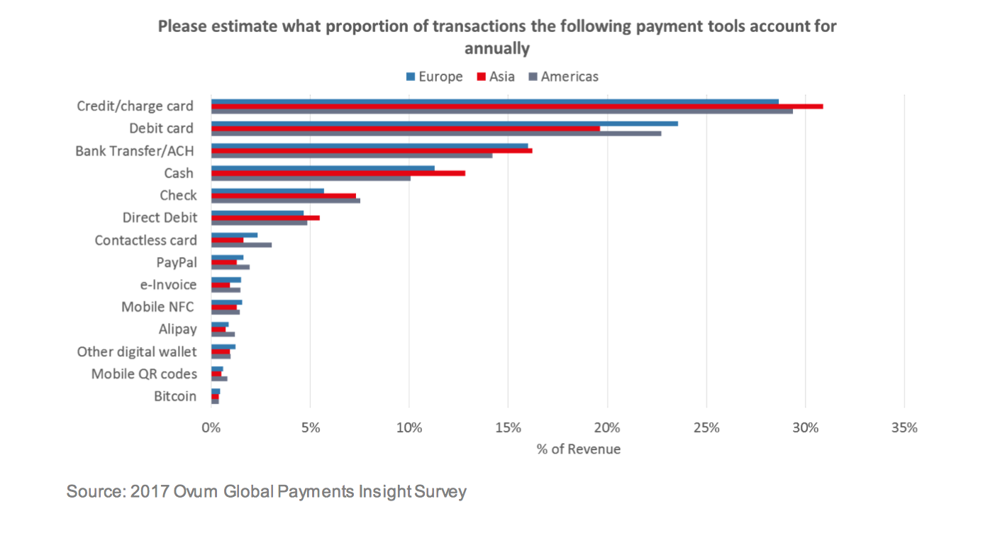 Traditional methods still dominate payments received by merchants and retailers but new payment technologies are gaining popularity, according to the 2017 Global Payments Insight Survey: Merchants and Retailers, by Ovum and ACT Worldwide. Debit and credit cards remain the most widely used payment instruments for retail/merchant transactions (along with other traditional methods including bank transfer, cash and cheque). Debit and credit cards alone account for roughly half of all merchant and retail transactions.