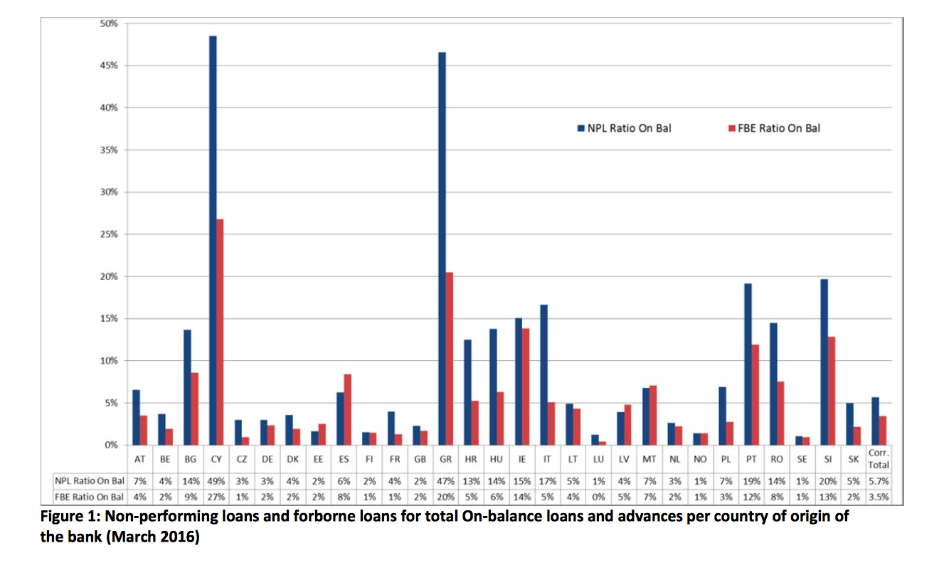 The table below shows the levels of NPLs and FBLs as a percentage of total loans for each EU country.