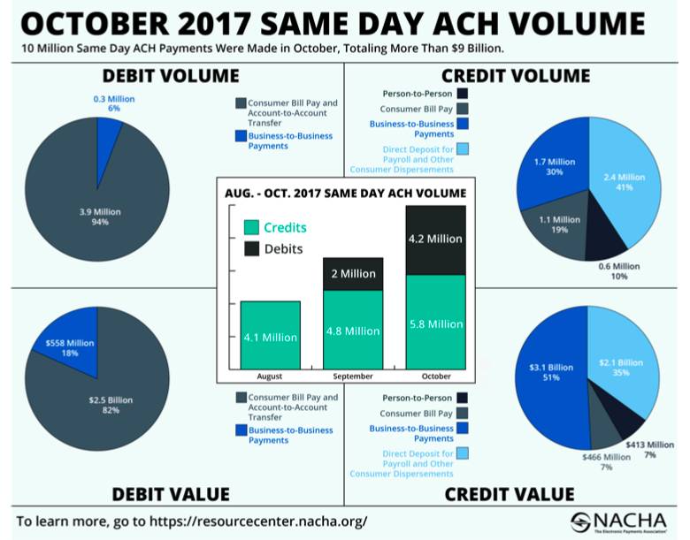 The volume of Same Day ACH payments more than doubled over the past two months to 10 million in October 2017, compared to a transaction volume of 4.1 million in August. Nacha – The US's electronic payments association said that more than $9 billion in value was transferred through Same Day ACH in October.