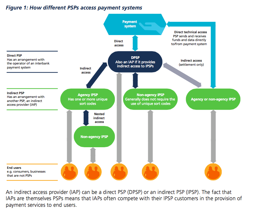 The chart below shows how PSPs can have either direct or indirect access to interbank payment systems. PSPs with indirect access (indirect PSPs – IPSPs) can be agency or non-agency IPSPs: