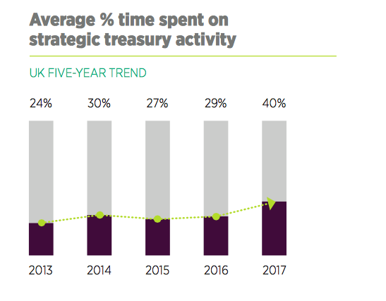 - Treasury has become increasingly strategic and the time qualified treasurers are spending on strategic issues has risen from 24 per cent in the 2013 survey to 40 per cent in this latest survey. The average time being spent on operational issues has remained constant at 33 per cent over the same period.