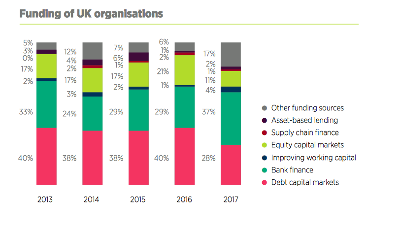 - Bank finance accounts for 38 per cent of funding and, together with debt capital markets (31 per cent, including private placements) and equity capital (13 per cent), that’s the lion’s share of funding at 82 per cent.