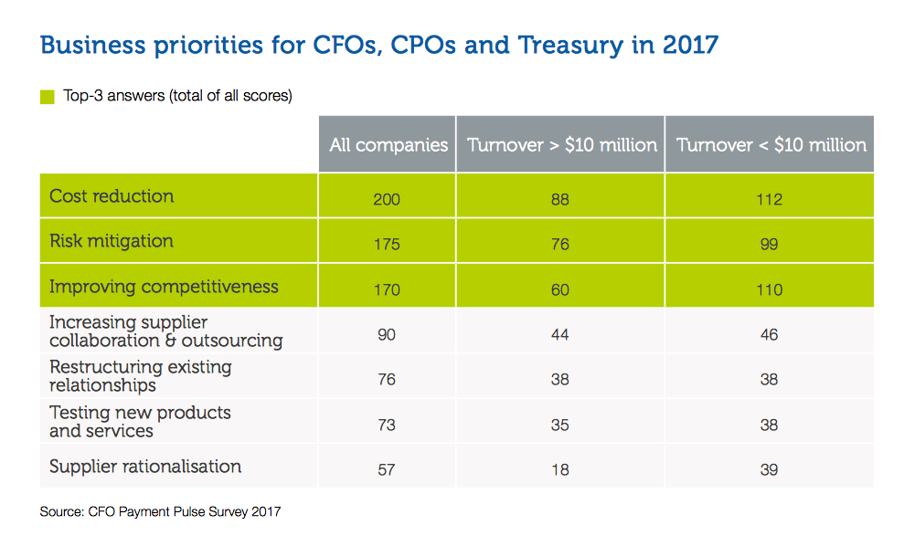 The following table, from the CFO Payment Pulse Survey 2017, shows that the top three business priorities for CFOs, CPOs and treasury in 2017 are: cost reduction, risk mitigation and improving competitiveness. But Ixaris's report argues that innovation is also a business priority for treasury: “... there is evidence that CFOs and their teams are becoming more interested in innovation and the role of new approaches in the treasury. Testing new products and services, and increasing outsourcing and collaboration with suppliers now outrank the desire to restructure existing relationships and supplier rationalisation.”