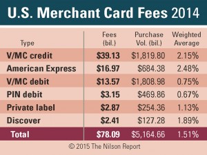 Processing fees, including interchange paid by US merchants to handle that business, were $78.09 billion, up from $72.44 billion in 2013 when cards generated $4.768 trillion, according to the annual report on US merchant processing fees published by The Nilson Report, a newsletter covering the card and mobile payment industries: